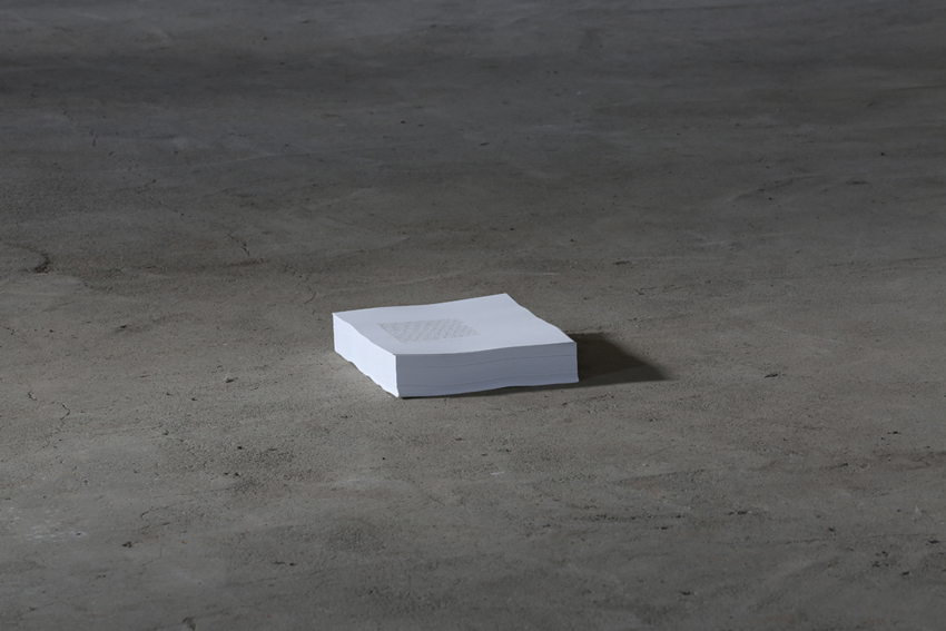 Katherine, Northern Territory, Australia, May 24, 2009, 2017 7 stacks of paper, text, 21 x 29.7 x 6 cm each installation view at Werksmidjan, Hjalteyri, Iceland